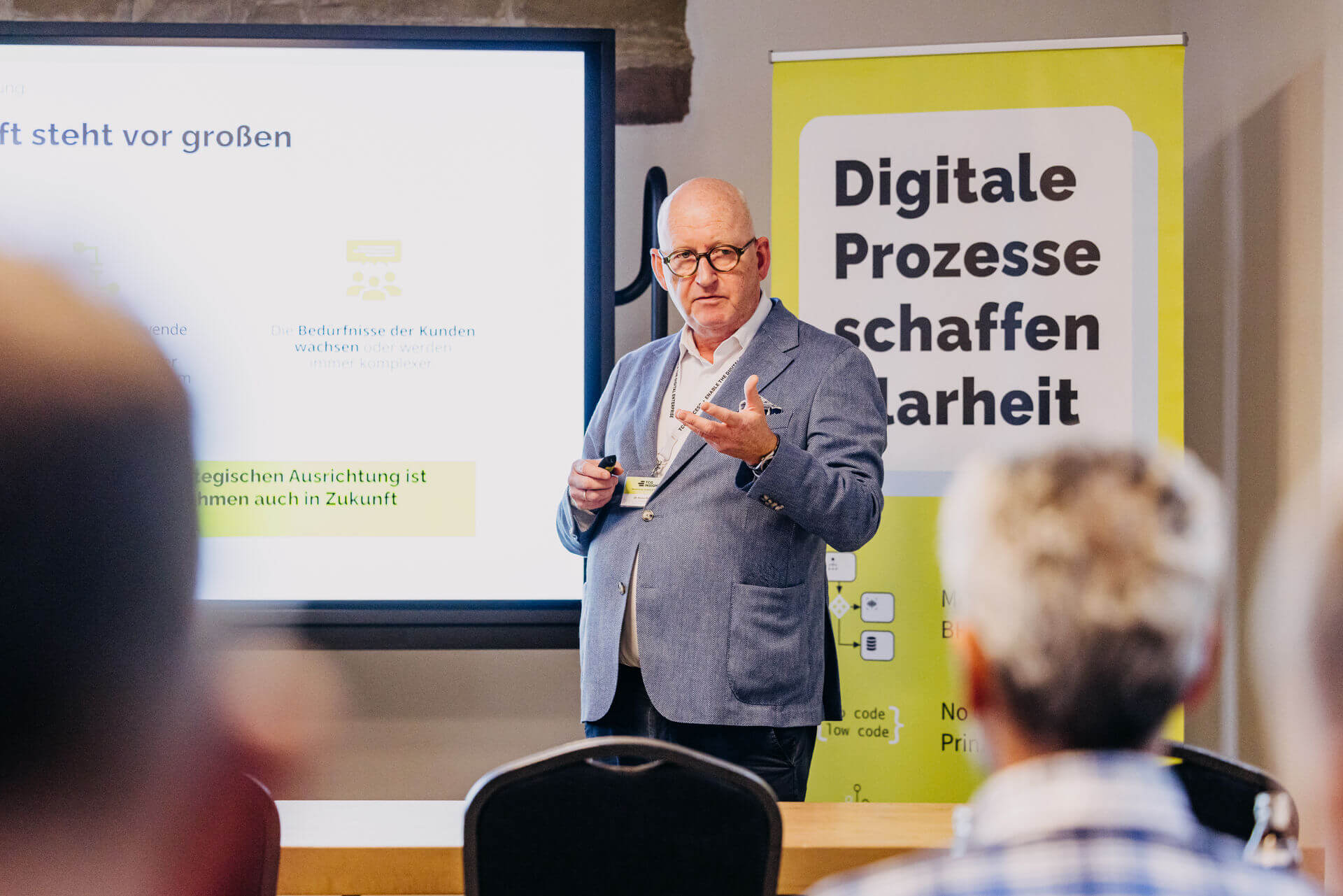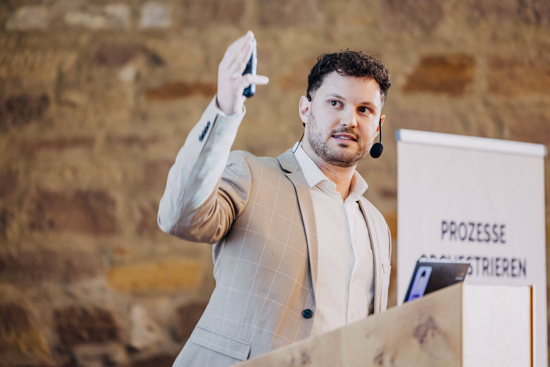 Nach der Eröffnung durch Erwin Schwarzl und Sara Mazzorana zeigte Felix Rank von Metafinanz in seiner Keynote, wie KI die Prozesslandschaft nachhaltig verändert und warum verantwortungsvolle Anwendung entscheidend ist.